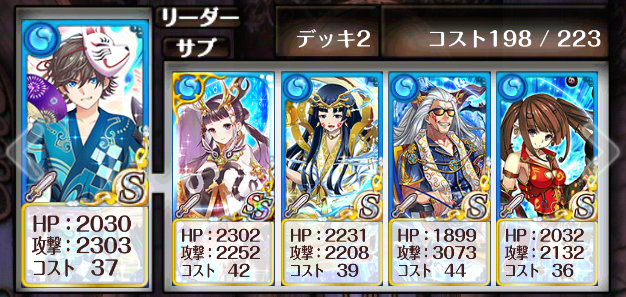 ちなみに、今日終わった後冷静に考えるとこちらの方が良かった気がしました…。私はホストでやらせていただいていたので、順番は1番で固定。とすると、無覚醒イリ&ジンを2覚トモエにしておけば6ターン目でシャッフルじゃなくパネチェンできるじゃん、と言う。アホや…。