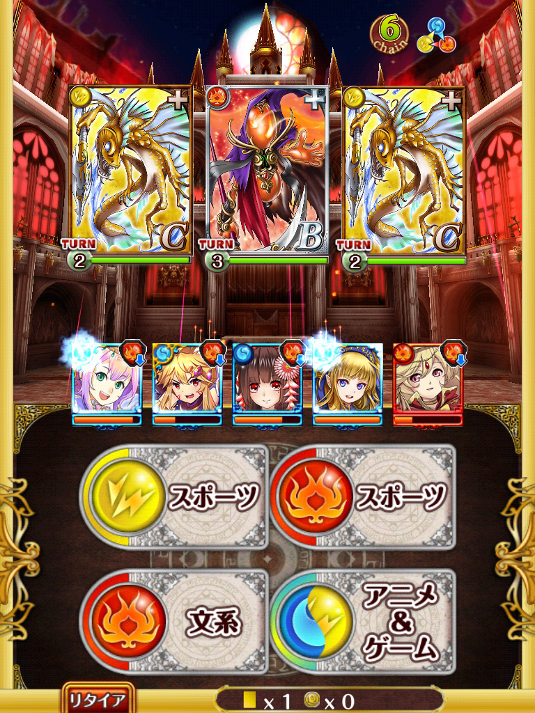 【1属性につき3体以下でクリア】。恐怖再び、です。一体も倒れずにクリアがついていないのは、「無理ならコンテすれば〜?(ヘラヘラ)」という事なのかと勘繰りたくもなりますが、これは優しさというのでしょうか…。ボス戦でデッキ縛りをつけてくるとかホント鬼畜だと思います、えぇ。