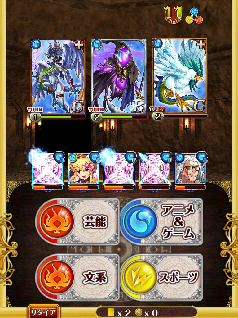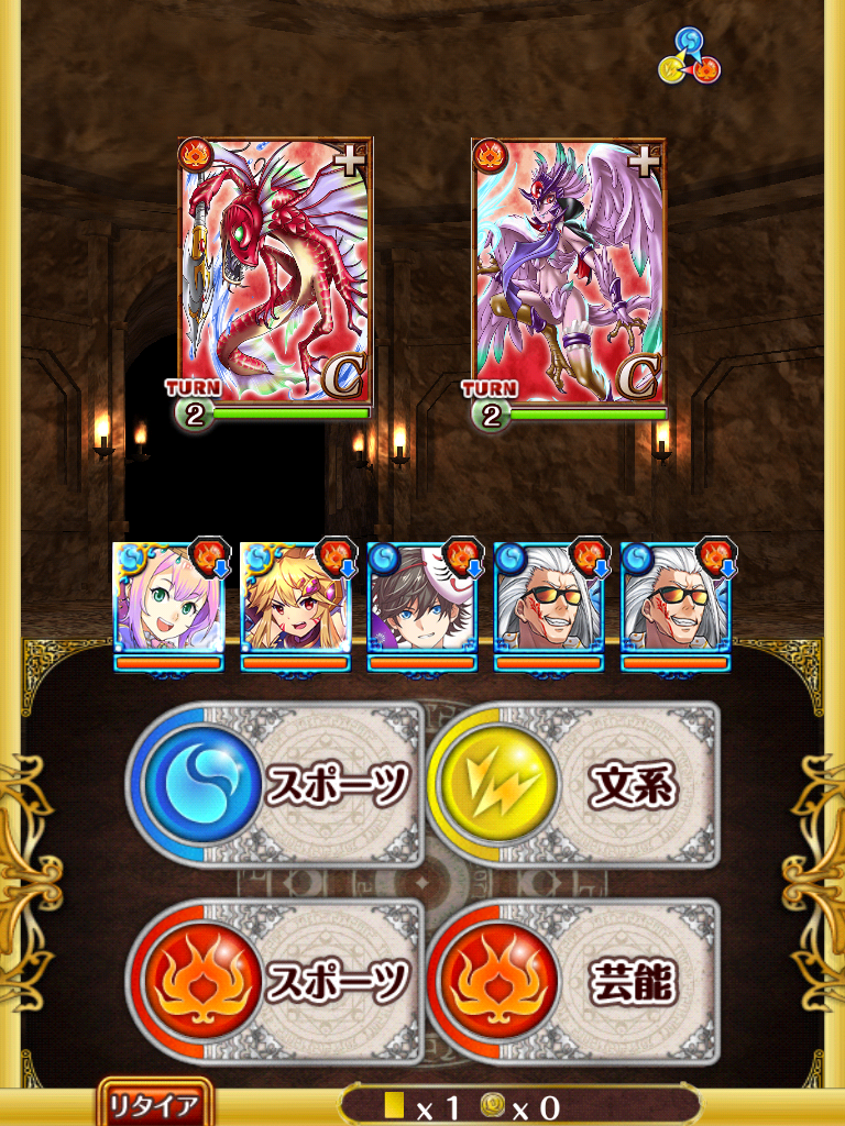 初戦は火サハギン、火ハーピーのコンビで固定。ハーピーは先制で属性弱体化です。火サハギンの初期ターンは1~2でぶれる模様。