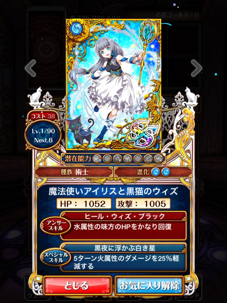 水属性のサポーターキャラで、ステータスはそこそこですが某誓ったッ!さんと同じ25%の5ターン軽減、しかも得意属性軽減です。